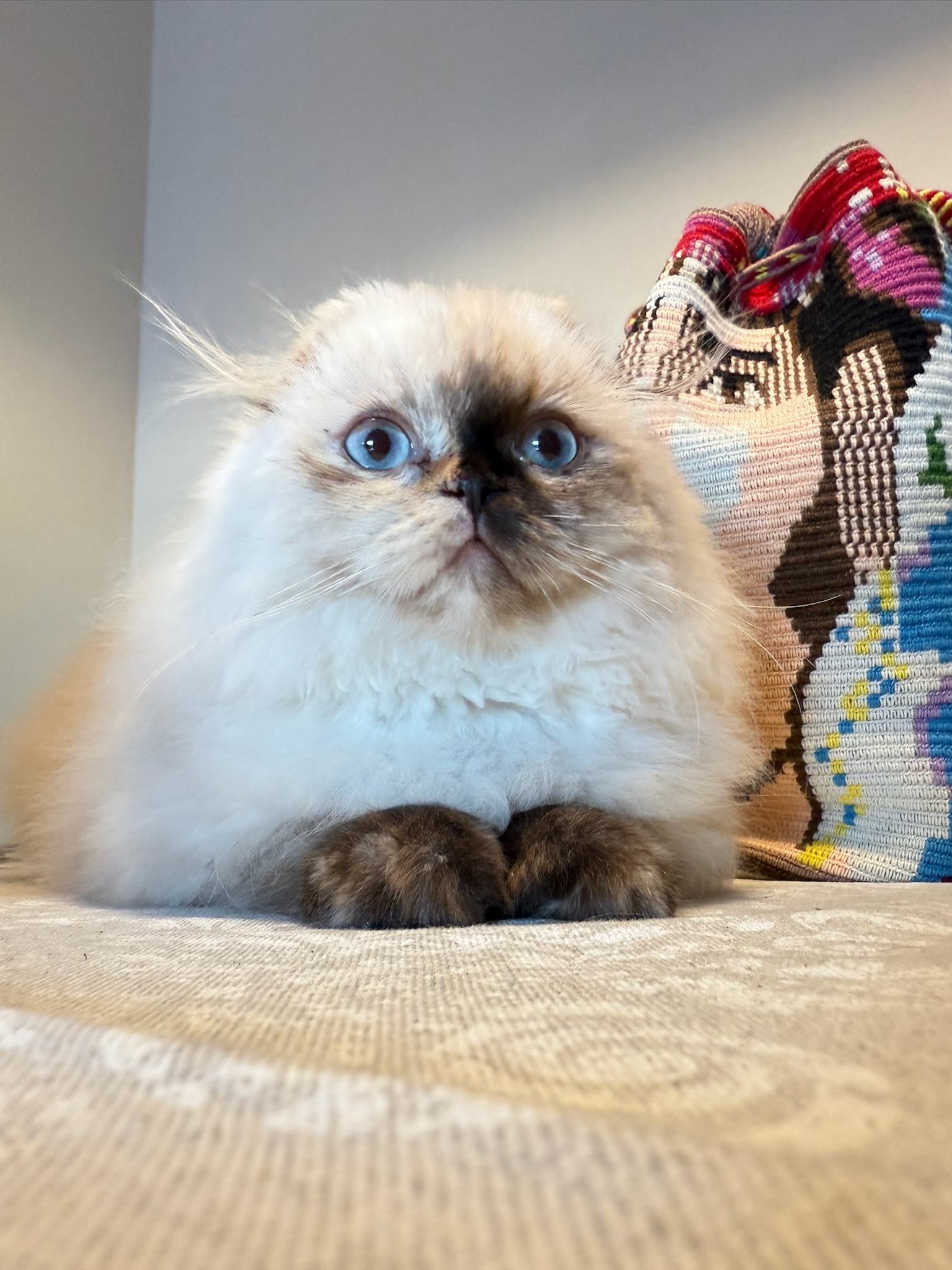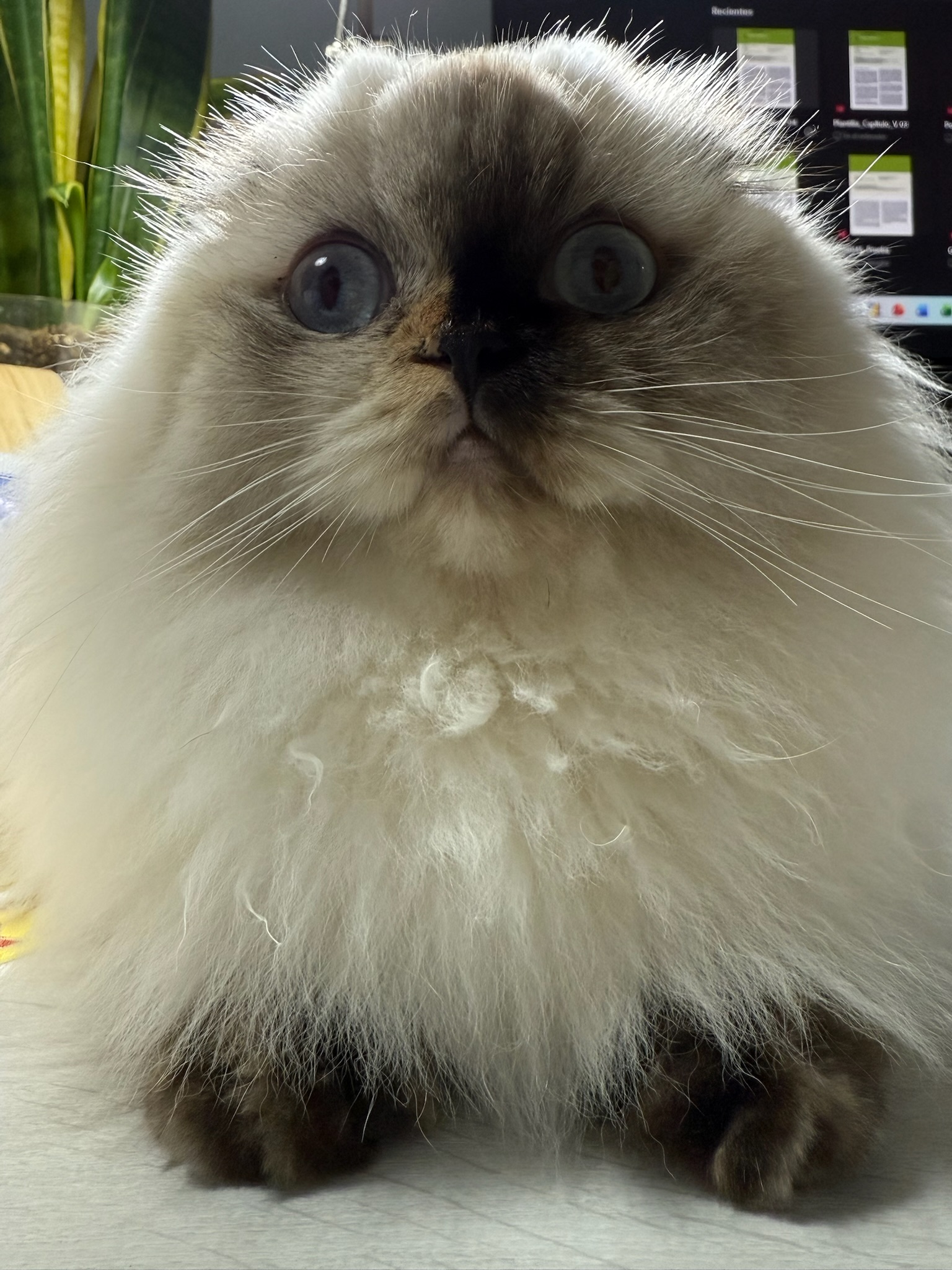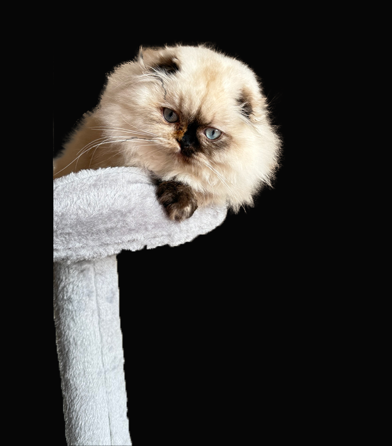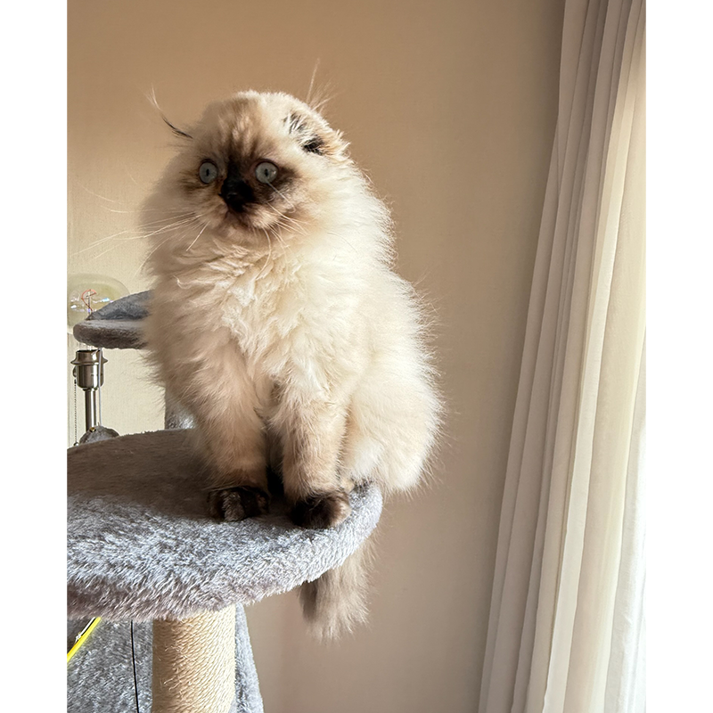 En la foto se aprecia su manto abundante y esponjoso, con una textura suave y un volumen espectacular que realza aún más su silueta redondita. Su cabecita armoniosa, el pliegue característico de sus orejitas Fold y su expresión “muñequita” hacen que sea imposible no sonreír al verla. Kyra combina elegancia y ternura en partes iguales: una presencia delicada, dulce y absolutamente inolvidable, fiel al encanto especial de la raza Scottish Fold.